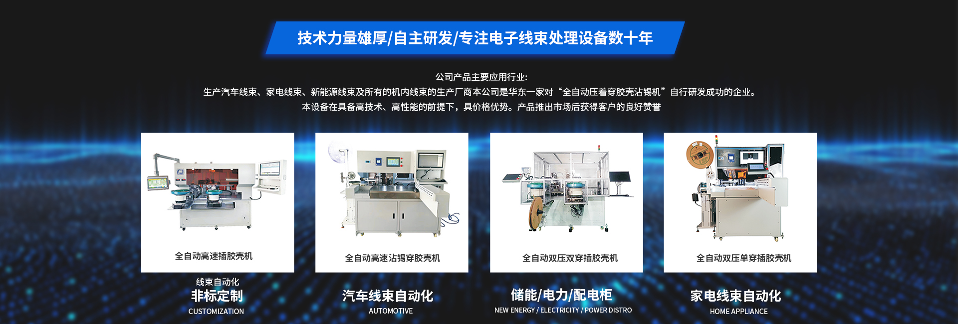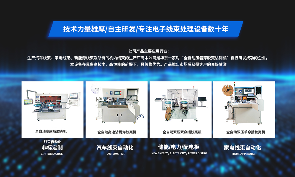 線束案例 本公司將遵循引進(jìn)改良、研發(fā)創(chuàng)新的原則,注重新產(chǎn)品的研發(fā)和產(chǎn)品性能、品質(zhì)的提高。為客戶提供更精良、 性價比更高的電線末端加工設(shè)備和提供更完善的售后服務(wù),與合作伙伴共創(chuàng)最佳業(yè)績。