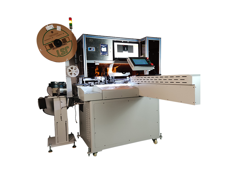 電線有無、兩端切斷、剝皮、檢測、壓端、壓力管理檢測(檢測有無壓斷銅絲與包膠皮)、壓端后視覺外觀檢測(檢測端子有無變形及壓接位置有無偏移及飛絲)、膠座有無檢測、 穿膠殼、拉力位移檢測(檢測端子是否插到位)、良品與不良品區(qū)分(不良品隱藏式收集)